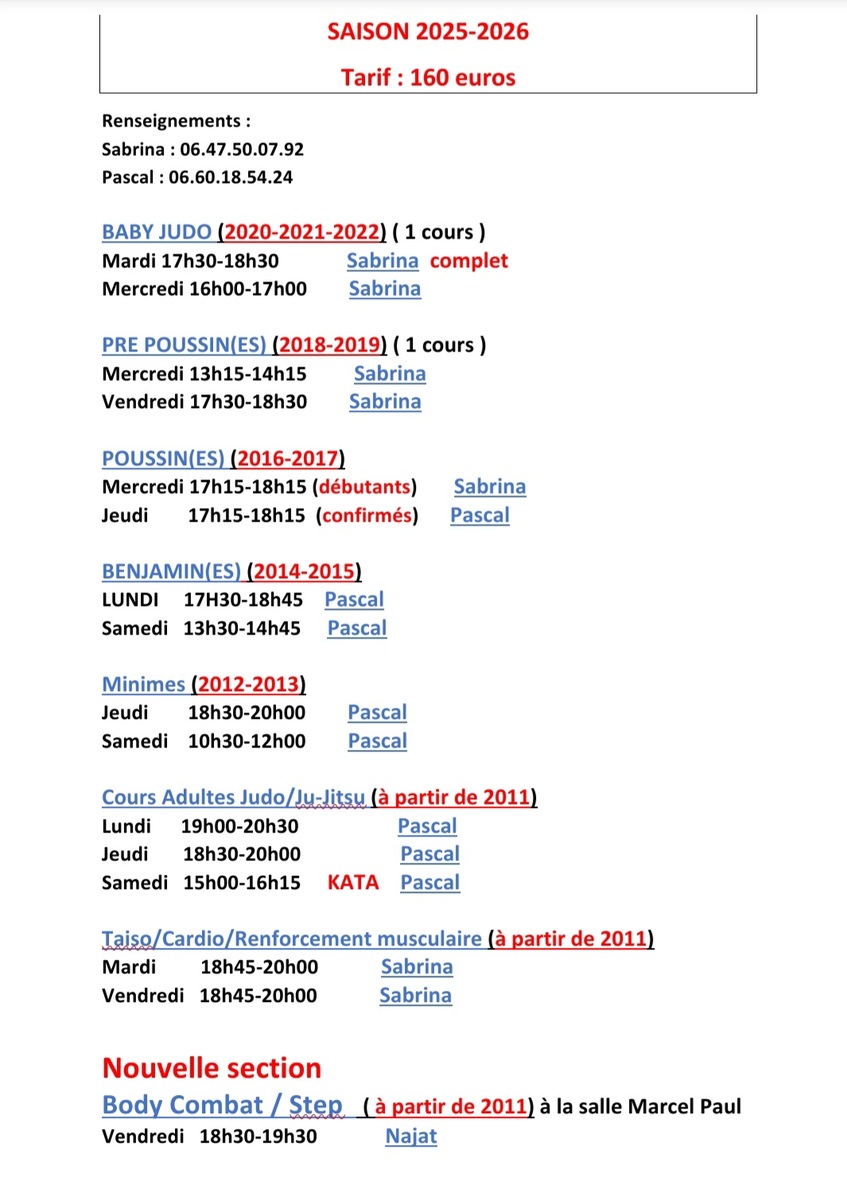 Horaires saison 2025-2026